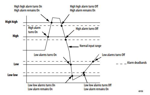 Misalnya, jika Anda mengatur modul 1756-IF16 (dengan penskalaan normal dalam volt) ke alarm tingkat 1,0 V / S, alarm laju hanya akan memicu jika perbedaan antara sampel input yang diukur berubah pada kecepatan> 1,0 V / S. Jika RTS modul adalah 100 ms, sampling data input baru setiap 100 ms) dan pada waktu 0, modul tersebut berukuran 5,0 volt dan pada saat 100 ms berukuran 5,08 V, laju perubahannya adalah (5,08V - 5,0V) / (100 mS) = 0,8 V / S. Alarm tingkat tidak diatur karena perubahan kurang dari titik pemicu 1,0V / s. Jika sampel berikutnya yang diambil adalah 4.9V, laju perubahannya adalah (4.9V… 5.08V) / (100 mS) = - 1.8V / S. Nilai absolut dari hasil ini adalah> 1.0V / S, sehingga alarm tingkat disetel. Nilai absolut diterapkan karena alarm tingkat memeriksa besarnya laju perubahan yang berada di luar titik pemicu, apakah tamasya positif atau negatif.